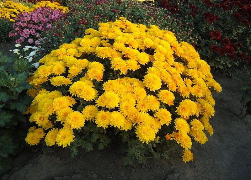 Хризантема мультифлора "Branindio" – это один из самых ранних сортов с уникальной окраской. В начале цветения цветы имеют оранжевый оттенок, который постепенно переходит в желтый с коричнево-золотистым отливом. Цветы помпонного типа достигают 4 сантиметров в диаметре. Кусты этого сорта начинают цвести с августа или первой декады сентября, образуя мощные и крупные растения. Шаровидные хризантемы мультифлора отличаются идеальной формой шара, полностью покрытого цветами, за которыми почти не видно листьев. Цветение начинается в конце августа – начале сентября, в зависимости от сорта. Кусты не требуют обрезки и формирования, так как их шаровидная форма является генетической особенностью.