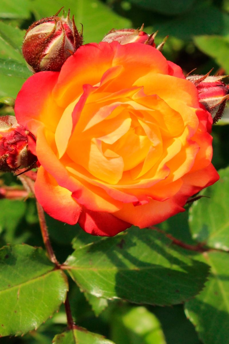 Саженец спрей розы Румба (Rumba) – это уникальный сорт, который привлекает внимание своими яркими и изменчивыми цветами. В начале цветения лепестки имеют насыщенный желтый цвет, который постепенно переходит в ярко-алый, а затем в малиновый оттенок. Обратная сторона лепестков остается желтой, а центр цветка сохраняет свой первоначальный цвет. Цветки имеют форму розеток и хорошо переносят влажную погоду, не осыпаясь, а засыхая прямо на кусте, что делает их менее подходящими для клумб.