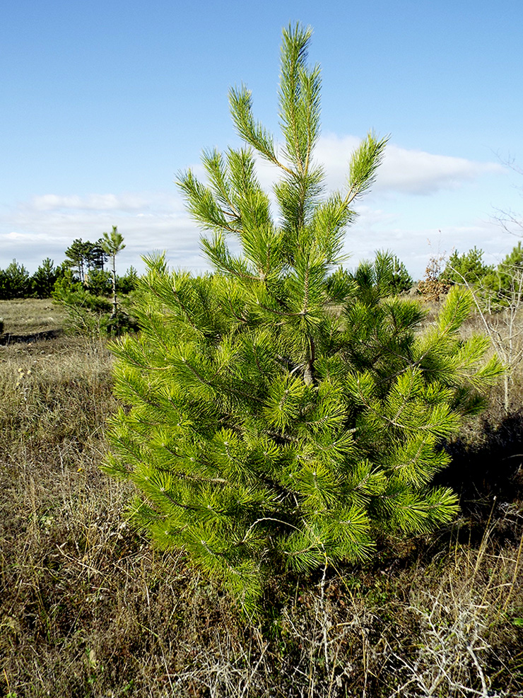 Саженец сосны крымской, высотой от 20 до 40 см, представляет собой молодое дерево, которое в будущем может вырасти до 30–50 метров в высоту. Этот вид сосны традиционно использовался в кораблестроении благодаря своим прочным стволам. Кора дерева темная, с трещинами, изменяющая свой цвет от темно-коричневого у основания до оранжево-красного у вершины.